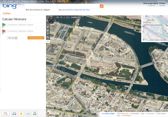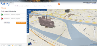 Notez que Bing Cartes offre aussi la vue en 3D, mais il est nécessaire de télécharger et d'installer le plug-in 3D pour accéder à cette fonctionnalité (encore incompatible avec le navigateur Google Chrome). La qualité des photos aériennes est un cran en-dessous de celles disponibles sur Google Maps.